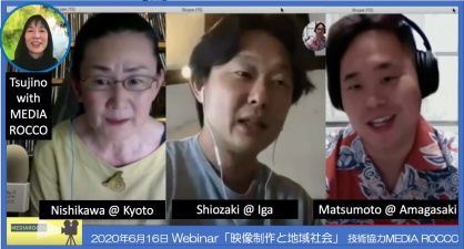 2020年6月16日に行われた「メディア文化論」Webinarは、「ライブトークショー」としての面白さがありました。辻野ディレクターの指示のもと出演者はオンラインでつながり、午前10時40分から生配信が開始されました。西川がWebinarのホスト役となり、塩崎氏をゲストに迎え、なぜ、どのようにあえて地方で2本の長編映画を制作したのかについて、学生からの質問もまじえて話を聞きました。そして最後の20分間に、「メディア文化論」3部を担当している松本章伸先生がトークに加わると、塩崎氏の話が一気に熱気を帯びました。松本先生は、甲南大学を卒業してからニューヨークの大学院で映像制作を学び、帰国後、NHKや民放のドキュメンタリー番組を多数制作してきました(甲南Ch 2018年7月4日)。また、日本のテレビドキュメンタリーの表現形式の歴史社会学を研究されており、授業ではメディアがもつ政治性や新しいデジタルメディアVICEについても紹介しました。視聴率が重視されるテレビ業界で活躍する松本先生と地方を拠点に新しい映画作りを模索する塩崎氏、方向性は異なるけれどもどちらも映像制作のプロです。表現手法についての突っ込んだ議論となりました。限られた時間でしたが、塩崎氏が「もっと話したかったなあ」と繰り返し述べるほど熱い余韻を残して「メディア文化論」Webinarは無事に終了しました。