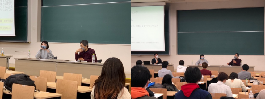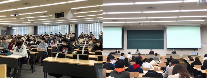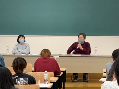 しかし後期になって対面授業が開始されたため、お二人に再度打診し、非常に前向きなお答えをいただきました。感染の拡大状況を見ながら、いつでもオンラインに切り替えられる準備もしつつ、又、感染予防のため、大きな会場で事前申し込み制にして人数も上限を決め、また、会場に来られない学生のためにオンライン同時配信の準備もしながら、無事当日を迎えることができました。