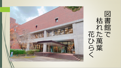 4年間で最も頻繁に通った場所である、図書館の写真を撮影しました。樹木の葉が枯れている情景が主題で、「枯れる」が冬の季語です。「萬葉」という言葉を選んだのは、私の卒業論文が『萬葉集』についての研究だからです。「萬葉集の歌に出てくる植物」がテーマに含まれているため、「花ひらく」という言葉は、『萬葉集』の知識を得たこととも繋がっています。図書館前の樹葉は枯れてしまっているけれど、自分の知識は豊かになっているということを詠みました。(日本語日本文学科4年生・Mさん)