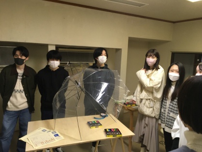 鑑賞後は、地域の方々のご厚意で貸していただいた自治会館で、イベントの感想を共有したり、各自が取り組んでいる研究テーマを発表したりと、成安造形大学の学生の皆さんとの交流を深めました。まったく領域が異なる大学、学科に所属する同世代の学生さんたちとの交流は、ゼミの学生にとって大きな刺激となったようです。