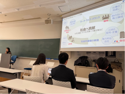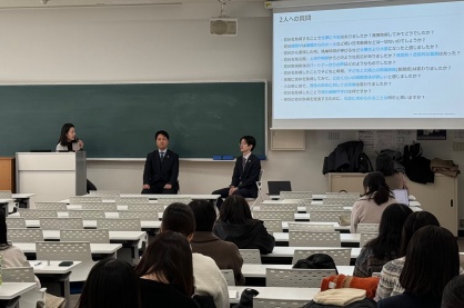 2024年2月28日(水) 文学部新着情報 お知らせの一覧 家族と仕事をテーマにした社会学科の専門科目である発展研究B(ライフスタイルと政策I)の授業のゲストとして、男性社員の育児休業推進の先駆的な取り組みを進める積水ハウスから、中心的な役割を担うダイバーシティ推進部の木原淳子さんと松岡優さん、実際にこの取り組みの中で1ヶ月の育休を取得された藤本知也さん(本学卒業生)と小玉拓也さんにお越しいただきました。