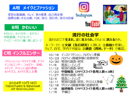 ■二回生後期に受講する「ゼミナール1」の今年の予定(その一部)は上のとおりです。似た関心の下で集まった「メイクとファッション」「かわいい」「インフルエンサー」の各班が共通テーマをめぐって切磋琢磨の共同調査。そしてパワーポイントを用いて研究発表。SNSやウェブサイトの内容分析、アンケート、インタビューなど社会調査のスキルを培い、身近な素材を通じて社会学感覚を磨き、集めたデータを活かすロジックを練り、説得力のあるトークによるポップでありながら学問的なプリゼンテーションを成就させてゆくのです。