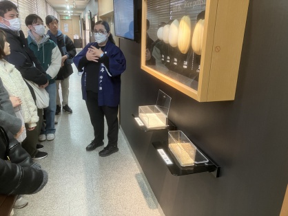 安福社長の講演後、福寿蔵にて、日本酒作りの過程を見学しました。見学会では、神戸酒心館・広報部主任のメソレッラ・チンツィアさんに解説していただきました。精米歩合による味の違いといった日本酒の基礎知識の説明を踏まえて、仕込み蔵を実際に見学しながら、日本酒造りの工程を学ぶという充実した時間を過ごすことができました。またメソレッラさんに海外からの見学者が多いこと、多言語での見学会の実施に対応していることもお聞きし、観光業への就職者が多い英文科のゼミとしては、日本酒造りの観光という側面を知ることは重要な学びの機会でした。