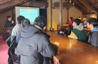 当日は、まず神戸酒心館代表取締役社長の安福武之助様より、同社のSDGsに関する取り組みを中心に話していただきました。安福社長の講演では、変化の大きい現代においても高品質の日本酒を作り続けるために神戸酒心館が取り組んでいる様々なプロジェクト——例えば、神戸市北区大沢町での酒米づくりの取り組みやボトルのリサイクル——を解説していただきました。またさまざまな酒造りをめぐる様々な技術革新についての話や、震災からの復興も含めた神戸酒心館の歴史からは、日本酒作りと神戸との深いつながりを理解することができました。