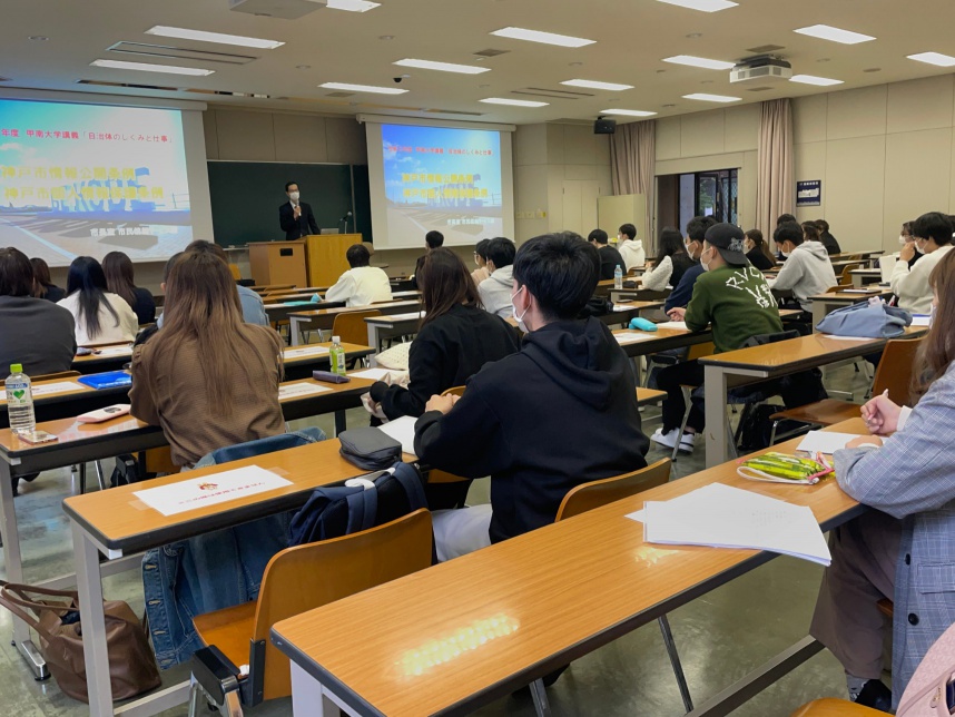 今回、神戸市職員による第1回目の講義があり、学生たちは、専門科目で学んでいることと実務のつながりに新鮮さを感じ、熱心に受講していました。