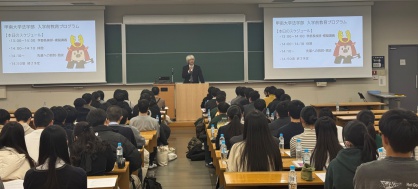 金丸学部長から、参加者の合格を祝うとともに、大学生活での心構えについてのお話があり、特に「学友を作ること」と「議論すること」の大切さを強調し、ぜひこの2つを大学で取り組んで欲しいと語られました。
