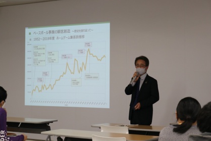 授業の大きなテーマは「スポーツビジネスと地域活性化」。今日はその第一弾として、阪神電気鉄道(株)執行役員/スポーツ・エンタテインメント事業本部副本部長の粟井一夫氏に「ベースボール事業の現状と課題」についてご登壇いただきました。