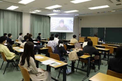 初回の前半には、指導主任の先生から授業の受講や学生生活を送る上での注意事項の説明がありました。また後半には全クラスをZoomで繋ぎ、奥田敬学部長からの歓迎の言葉のあと、教員一人ひとりの紹介動画を視聴しました。