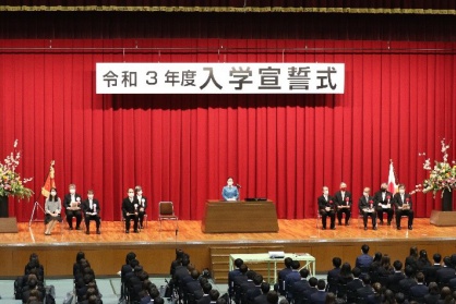4月1日に『令和3年度入学宣誓式』が行われました。当日は、新型コロナウイルス感染症対策として、対面での式典には新入生のみが参加し、保護者のみなさまにはYouTubeで式典の様子をライブ配信しました。