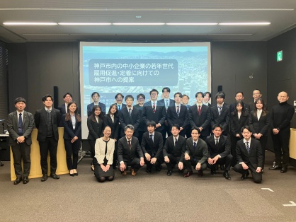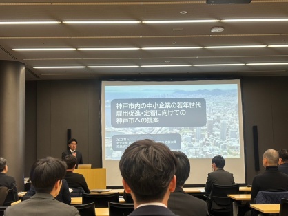 2023年度のゼミ活動では、「加古川市における雇用・子育て支援政策」をテーマに研究を行い、企業と市を結ぶ施策の改善提案を行いました。この経験を活かし、2024年度は「神戸市内における若年層の雇用促進・定着」をテーマに調査研究を行い、政策提言を行いました。その背景には、神戸市の人口減少(若年層の社会減)が続くなか、中小企業を中心に、新卒・第2新卒の採用難が深刻化しています。そこで、関西造園土木株式会社、兵庫ベンダ工業株式会社、株式会社シマブンコーポレーション、中小企業投資育成株式会社、神戸市の皆様のご協力のもと、視察・ヒアリングを行い、神戸市における中小企業の求人動向、就業状況、福利厚生等を明らかにしました。一方で、本学3回生及び4回生を対象に学生の就業ニーズをアンケート調査で分析しました。これらの分析結果と現状を踏まえ、以下の報告会で、神戸市における中小企業の若年層の雇用促進・定着を目指して政策提言を行いました。
