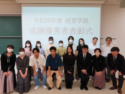 経営学部では、1年間の成績が優秀であった学生を成績優秀者(1・2・3年次の各年次の上位3%程度の者を選考)としており、選考の結果、新2年生は14名、新3年生は12名、新4年生は12名が表彰されました。