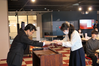 髙室学部長による挨拶の後、成績優秀者全員に表彰状と記念品が手渡され、各学年の代表者一人がそれぞれスピーチを行いました。