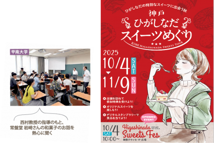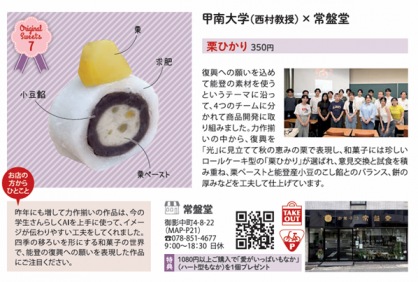 西村順二教授が長年実行委員会会長を務めてきた「ひがしなだスイーツめぐり」が、今は神戸市の直轄事業となり継続されています。このイベントと西村順二教授が担当する講義「起業・アントレプレナーシップ」が連携を組み、文学部、理工学部、経済学部、経営学部、マネジメント創造学部の2~4年生がマーケティング論に基づき、また生成AIも活用して、スイーツの研究開発・製品化を行いました。2025年度ひがしなだスイーツめぐりでは、販売が行われています。今年度は、石川県能登の小豆を使った被災地へのエールを込めて、震災30年を迎え、被災も経験した神戸に立地する大学の学生として「栗ひかり」を提案したものです。復興への希望を大粒の栗に、能登へのエールを石川県産大豆に、そして神戸からの支援の思いを栗ペースト・石川県産大豆餡・求肥という3重の層に被災後30年の思いを込めて作ったものです。