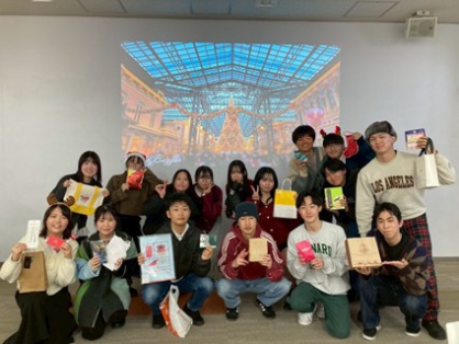 勉強だけではありません。新入生歓迎会や飲み会、クリスマスパーティーなど、授業や学びの枠を超えた楽しいイベントも盛りだくさんです。写真は、今年のゼミでのクリスマスパーティーの時のものです。みんなでピザを食べて、プレゼント交換やビンゴゲームを楽しみました。