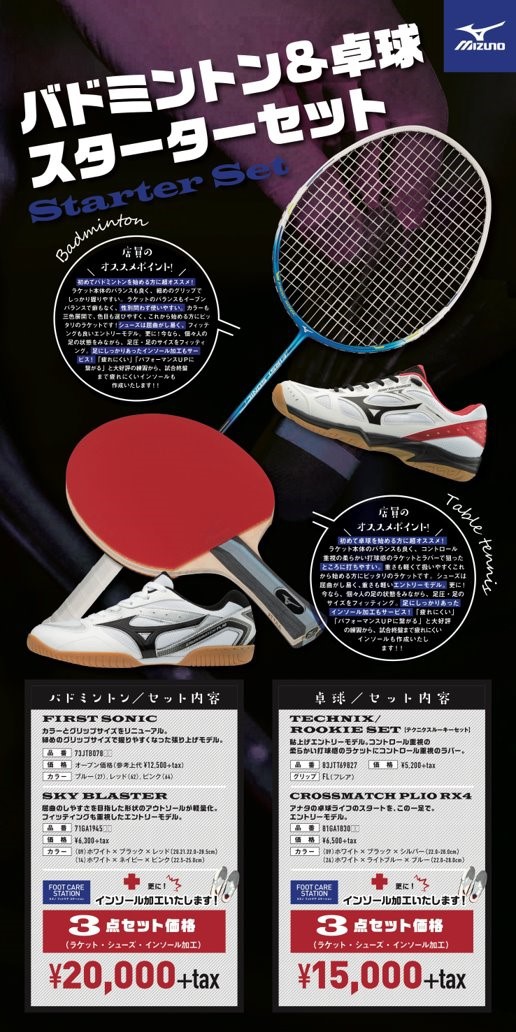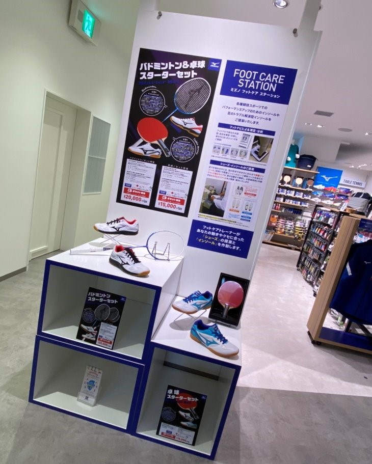 今回我々が提案したのは初心者向けミズノ製品を主軸にしたスターターセットです。ラケット種目は一度使い続けたブランドから変える選手が少ないことから、初心者をターゲットにするという狙いがあります。しかし、スターターセット自体は目新しいアイデアではなく、他の大型店舗などでも見ることができます。そこで我々はミズノ独自の強みである「インソール(中敷き)加工」をセットに組み込むことを提案しました。このインソール加工は選手の足を守り、怪我を予防するだけが強みではありません。バドミントンで重要な一歩目の踏み出しや、卓球で重要なフォアハンド・バックハンドの切り替えなど、個々の“苦手”をサポートする性能があります。インソール加工は選手の足の特徴を精密に測定した上で行われるので、他にはない「技術面をカスタマイズできる」スターターセットを実現する要素になっています。