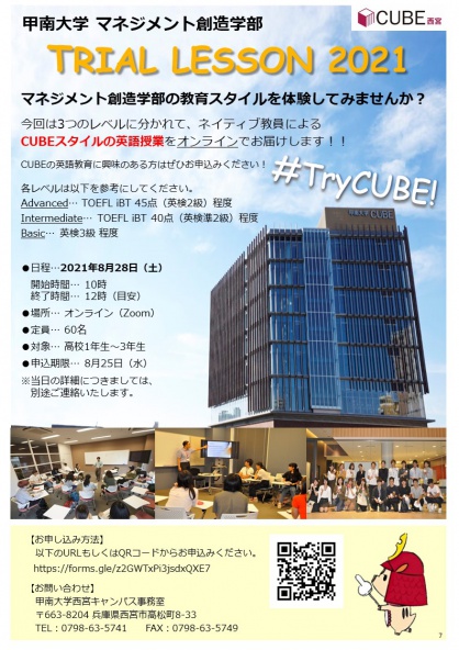 2021年8月20日(金) マネジメント創造学部新着情報8月28日(土)に開催予定の「TRIAL LESSON」につきまして、今年度は新型コロナウィルス感染拡大に伴う緊急事態宣言の発令により、オンラインでの開催に変更させていただきます。