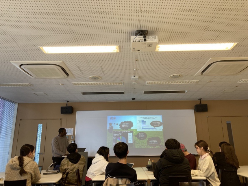2025年1月24日(金) マネジメント創造学部新着情報 お知らせの一覧 グローバルプロジェクト【開発経済-アフリカ各国の経済成長-】の授業で、現在日本に留学中のMigan Anthonyさんをゲストに迎えました。Miganさんは西アフリカのベナン共和国から来日され、2022年から神戸情報大学院大学で学び、この4月からは甲南大学に進学することが決まっています。