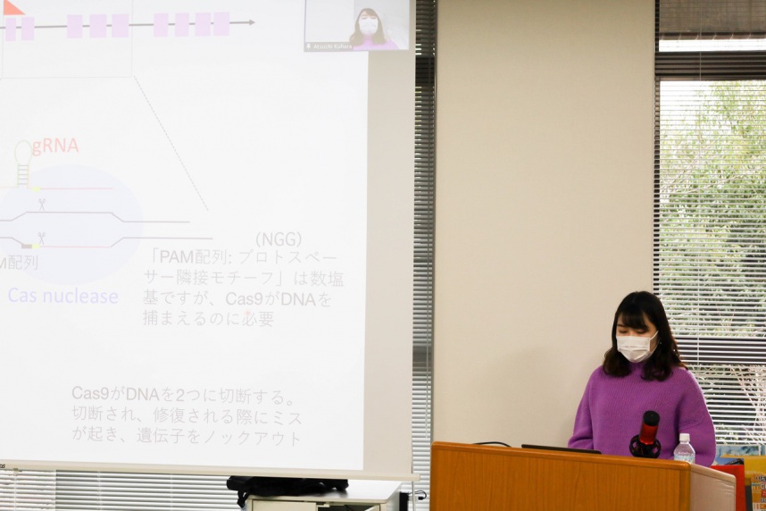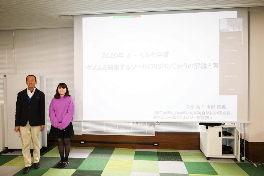 12月24日に行われたノーベル化学賞の解説は、遺伝子工学の技術である「ゲノム編集」について、画期的な方法を発表した2人の女性科学者に焦点をあて、理工学部生物学科の久原篤教授が2020年ノーベル化学賞の全容を、自然科学研究科生物学専攻修士課程2年次の水野賢美さんからは自身の研究に活用した実験内容について発表いただきました。