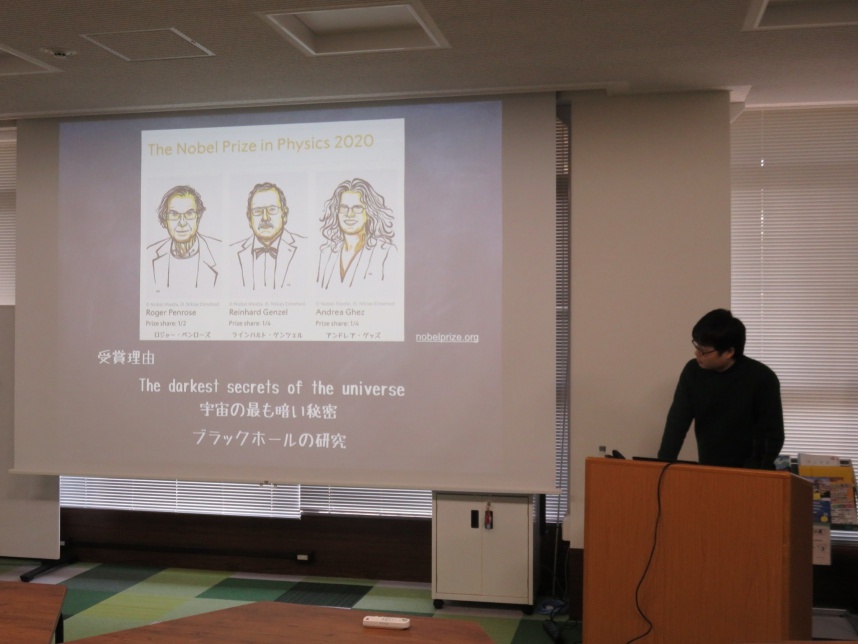 続いて、1月13日に行われたノーベル物理学賞の解説は、ブラックホールの「宇宙の最も暗い秘密」に関して、3人の研究者に焦点をあて、理工学部物理学科 冨永望教授と大神隆幸研究員が行いました。大神研究員は、今年のノーベル物理学賞テーマにも関連する「ブラックホール研究」の第一人者であります。