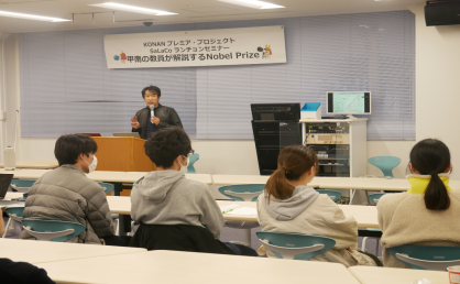 2024年度の第一弾として、12月4日(水曜)に『甲南の教員が解説するNobel Prize 2024 ノーベル生理学・医学賞』を開催しました。当日は、「対面・オンライン」形式をとりながら、昼食時間を利用して、ご飯を食べながら講演を聞くスタイルで実施しました。