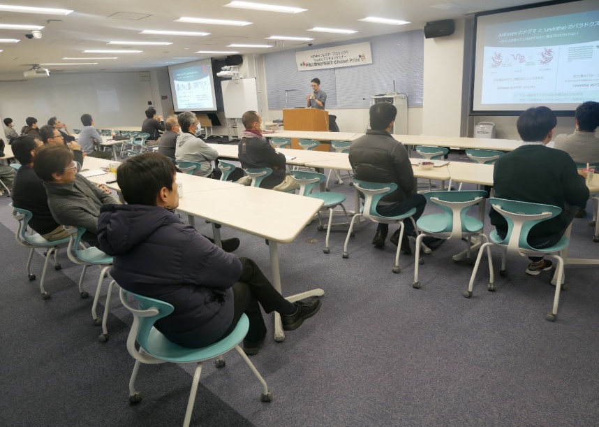 約50年前、タンパク質の研究が進展する中で生じた「タンパク質の構造がアミノ酸の配列で決まるならば、アミノ酸の配列からタンパク質の立体構造を予測できる?」という興味深い疑問は、「生化学50年来の問題」と言われ、とても難しい問題であるとのことです。こうした難問を解明していく3名の成果を、1994年より始まったCASP (タンパク質構造予測の世界大会)」での取組や成果などを含めてご紹介いただきました。