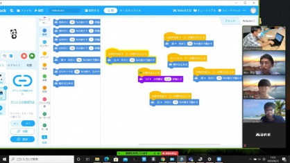 8月22日に,スーパーIT人材育成プロジェクトの一環として,オンラインロボットプログラミング体験会を開催しました.オンラインで行うのは初めての試みです.1年生3名が自宅からオンラインで参加し,ロボット(Makeblock社mBot)のプログラミングを行いました.このロボットは,パソコンの画面上でブロックを組み合わせるだけでプログラムを作ることができます.