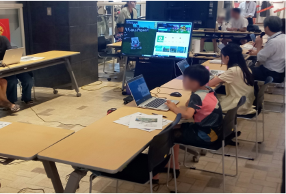 当日は、知能情報学部の新田先生、北村先生、学生3名が子どもたちの先生となり、教育版マインクラフトを用いてプログラミングの基本の体験、またマインクラフトの世界がプログラムされた通りに変わっていく様子を見ながら、実際に触れて体感いただきました。自分でプログラムを組み立て、想像した通りに画面上でアクションが起こることを通じて、楽しみながらプログラミングを学んでいただくことができたと思います。