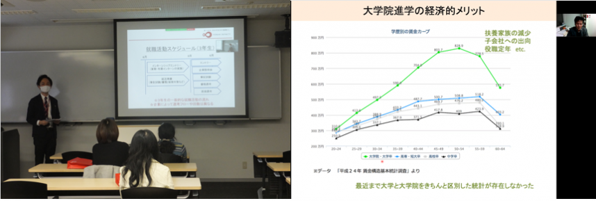 その他、一度企業に就職した後に研究者を志して大学院進学したFIRST教員の体験談や、大学院に掛かる学費とその後の給与や就業確率を天秤にかけた解説などをもとにした、大学院に関する説明もありました。