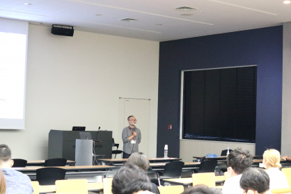 後半は、「理系キャリアとしてのアカデミックポジション」をテーマにご講演いただきました(写真上)。FIRST院生時代、海外での学会発表で自らの成長を実感し、その後のアメリカ留学や研究職を志した当時を振り返り、「挑戦を続けることが成長の近道。FIRSTの皆さんもやりたい事を見つけ、あきらめずに進んでほしい」とお話しいただきました。