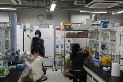 昼食をはさんで、午後からは、長濱教授の研究室で「ハイドロゲルを用いた細胞移植に関する実験」に取り組みました。生徒さんからは、「実験の感じがわかりました」「実験の経験がほとんどないので、非常によい経験になりました」と言っていただきました。