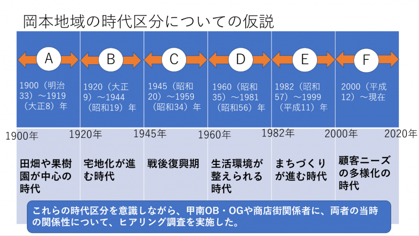 甲南大学と岡本地域の関係性の変遷を探る「岡本・原風景調査プロジェクト」は、2018年度から3か年のプロジェクトで、本年度が最終年度である。年表、地図、商業動向、人口動向、写真資料等から、地域の大きな変化をもとに(図1)時代区分の仮説を立て、それに基づいて文献・ヒアリング調査を実施した(図2)。詳細は、前回の報告を参照いただきたい。今回は2020年12月20日に実施された研究発表の場である「リサーチフェスタ」、2021年1月11日に実施した商店街関係者や調査協力者向けの成果報告会とその成果を中心に報告する。