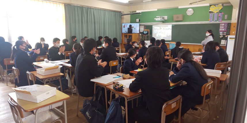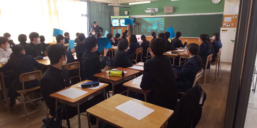 私たちの授業は座学とワークショップに分かれ、座学の部分ではコロナ禍での多様化する避難の方法や避難所運営方針など、現状に沿った防災知識について説明しました。またハザードマップを使って魚崎町の津波のリスクを知ってもらうとともに、加えて魚崎町の緊急避難場所や災害時給水拠点の場所なども説明しました。全てのクラスの生徒達が、真剣にこちらの授業を聞いている様子が伺えました。