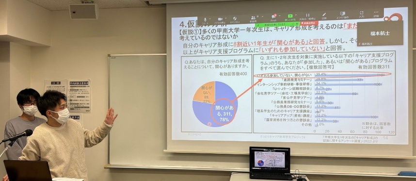 2022年12月12日に開催した成果報告会では、鳥取県関西本部の本部長の高務(たかつかさ)氏より、「キャリアというと、どうしても『就職』をイメージする傾向があります。しかし、鳥取県への移住者のみなさんは、長い人生をより豊かに楽しく暮らすために、仕事に限らず、様々な活動に取り組んでおられます。その魅力に触れて、鳥取県に新しいイメージをもってくれた5人の甲南大学生の存在は大きな財産です」との講評を受けました。また、全学共通教育センター特任准教授の武田佳久氏には、自宅および一人暮らしの学生による比較など、示唆に富む分析視点についての指摘をいただきました。学生は、教員だけでなく実務家や地域の様々な人々とのやり取りを通じて、実に多くを学んでいます。