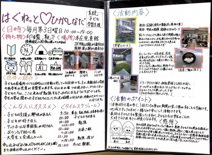 冊子は、volunteer(ボランティア)と cheer(チア,応援する)を掛け合わせ、活動の後押しをしたいという意味を込めて「voluncheer(ボランチア)ガイド」と名付けました。今回は「チーム御前浜・香櫨園浜里浜づくり」、「はぐねっと♡ひがしなだ」、「放課後等デイサービスえびす本山」の3団体のボランティア活動を掲載しました。ボランティア内容や活動のポイントを紹介し、実際に活動した際の写真を掲載したり、イラストを描いたりして見やすくなるように工夫し、親しみやすさを感じてもらえるよう手描きでまとめています。