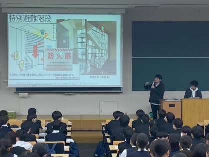 最後に、豆知識として、グループワークで取り扱ったビルからの避難と避難した後のことに焦点を当てて伝えました。グループワークで発生した細かい疑問に答えていく事で、生徒が疑問を残さずに進めるよう取り組みました。