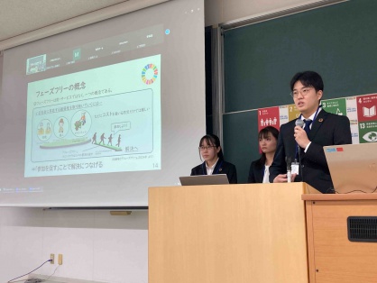 2024年11月17日に開催されました成果報告会「チャレンジアカデミー」では、大学生と高校生の混成チームにて、「フェーズフリー」に基づいた3つの取り組みを徳島市に提案しました。ひとつはAR(拡張現実)の技術を生かして疑似的な災害状況のなかで、フェーズフリー商品を使った防災行動をゲーム形式で学ぶ拠点の提供です。もう一つは、避難ルートをウォーキングコースに設定し、災害時に使用頻度が高いであろう公衆電話や消火器の使い方などを、屋外路面シートにしてウォーキングコースに配置します。最後は、プロの料理人監修の防災レシピの開発です。あまり美味しいイメージがない長期備蓄食品を、アレンジ次第で美味しく食せることをSNS等で発信するというものです。こうした取り組みを通じて、事業者によるフェーズフリー商品の開発を促す「12:つくる責任、つかう責任」を、身近な食や運動による防災対応力の向上によって「3:すべての人に健康と福祉を」等のゴールを達成することをめざすことを意図しています。