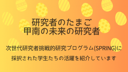 2021年に「次世代研究者挑戦的研究プログラム(SPRING)」に採択されました。このプログラムは、日本の科学技術・イノベーションの将来を担うという意欲を持って努力している優秀な博士後期課程の学生が、研究に集中できるように経済的にサポートするとともに、将来にわたって幅広く活躍できるよう、多様なキャリア選択肢を用意することを目的としています。