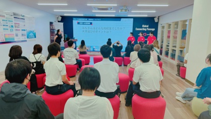イベント会場となった「Global Connecting Passage」は、大型LEDモニターが特長的なSTAGE生向けの新しい施設。STAGEでの学びの様子をスクリーンに投影しながら、「STAGEを選んだ理由は?」「大学生活で印象に残っていることは?」「大学4年間や将来の夢・目標」など、三者三様の視点でSTAGEの魅力を語ってもらいました。また、来場者の皆さんから先輩学生へのQ&Aタイムもあり、大学の雰囲気や受験勉強のポイントなど、それぞれ質問がありました。