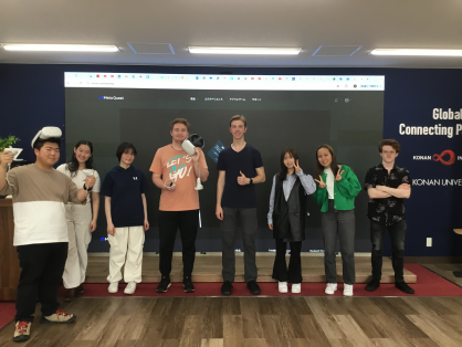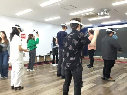 GCPでは、留学生との交流イベントが定期的に開催されています。2024年4月には、甲南大学で学んでいる留学生を中心に、国内外で人気なVR(バーチャルリアリティ)のリズムゲーム「Beat Saber(ビートセイバー)」を体験するイベントが実施されました。このゲームでは、プレーヤーはVRゴーグルとコントローラーを使って、仮想空間内に出てくるブロックをリズムに合わせて切っていきます。プレーには設定が必要なため、留学生が日本人の参加者に対して英語で説明を行ってからゲームが始まりました。飛び入り参加も歓迎だったので、複数人が入れ替わり立ち代わりプレーし、STAGEの学生を含めた多くの甲南生が留学生との交流を深めました。