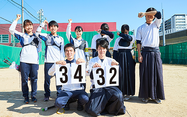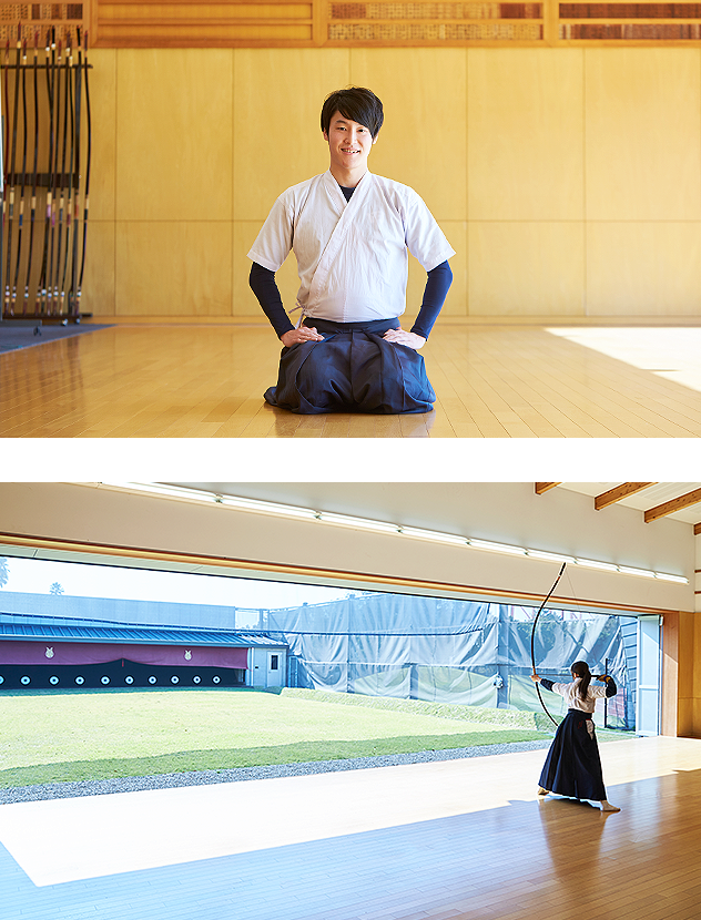 弓道は他の競技と異なり、「的」を相手にするスポーツです。それぞれが自分の体力に応じた強さの弓を使い、確実な上達に向けた練習をおこなうことができます。照準器のない弓で、狙いを定めるのは自身の目と体感が頼りです。一本の矢に想いを込めて放つ姿の美しさは、日本の伝統武道ならではの魅力。日本文化に興味をもつ留学生も数多く見学に来ます。2010年、六甲アイランド施設内に新道場が整備され、練習環境は抜群。弓を放つ際の弦音が美しく響く広々とした射場で、練習と競技に集中できる環境が整っています。