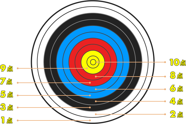 距離は実際の競技距離と同じで、直径80cmの的に、弓道部は28m、アーチェリー部は30m離れ弓を放ちます。得点は中心から4cm幅ごとに10・9点(黄色)、8・7点(赤色)、6・5点(青色)、4・3点(黒色)、2・1点(白色)と外側にいくにつれ低くなり、的から外れた場合は0点です。両チーム4名が交互に1射ずつ射ち、当たった的の点数の合計点で競います。